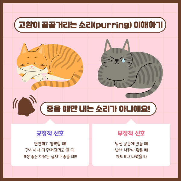 고양이는 아프더라도 내색을 하지 않고 숨기 때문에 잘 알 수가 없는데요. 알 수 있는 신호 중 하나는 밥을 잘 먹지 않고 구석에 숨어서 골골거리는 소리를 낼 때인데 이때 고양이의 컨디션을 꼭 확인해 주셔야 합니다. 이 골골송은 스스로 통증을 줄이거나 치유를 돕기 위해 또는 심리적 안정감을 찾기 위함입니다. 이 주파수가 치유를 능력을 향상하고 통증을 완화하는데 도움이 된다는 연구 결과가 있습니다. 그래서 고양이가 스스로의 치유를 위해 골골거리는 것인데 집에서 골골송의 소리가 조금 다른 것 같다면 꼭 상태를 살펴봐 주세요.